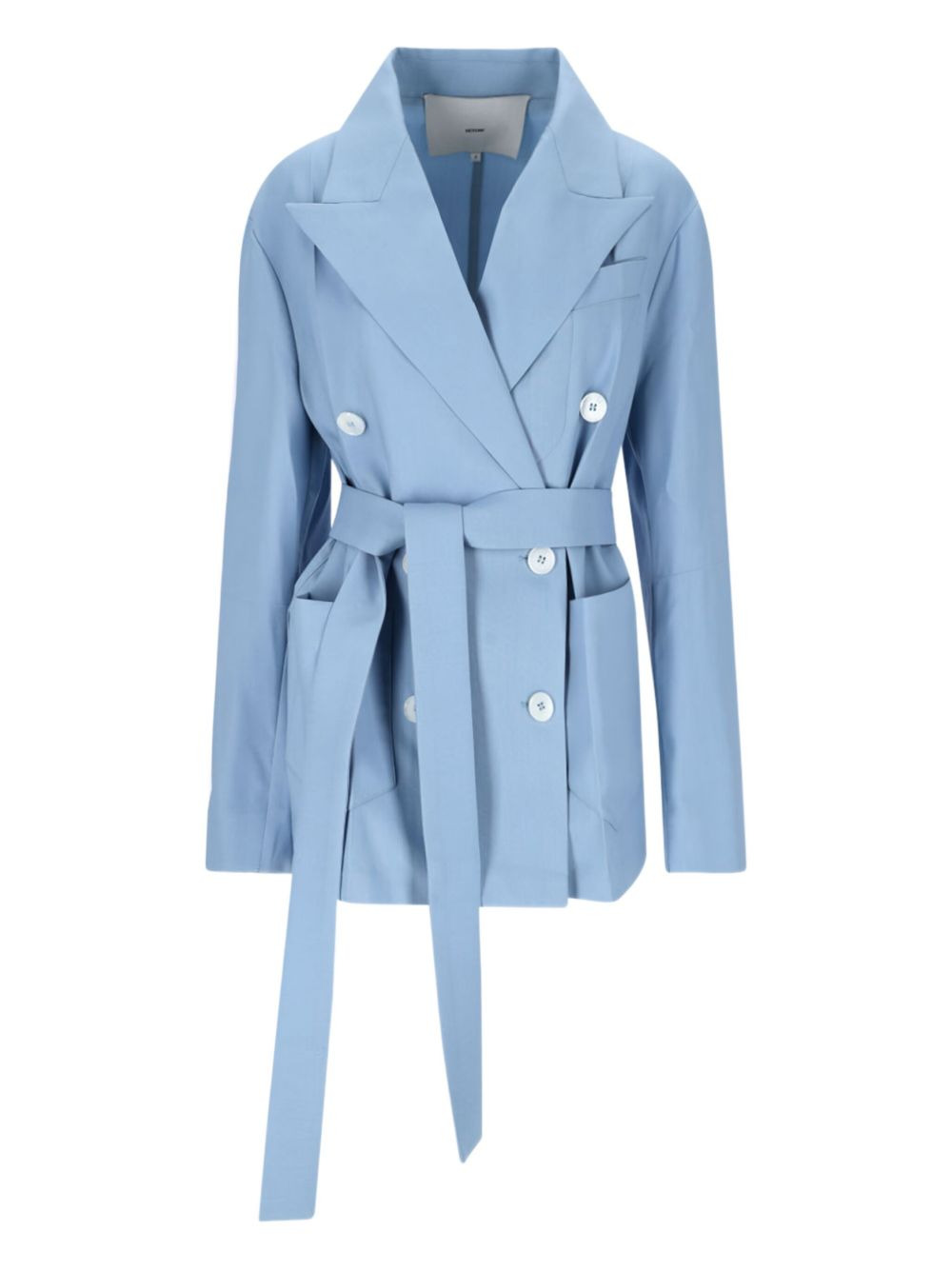double-breasted belted blazer Highlights - Light blue - Double-breasted button fastening - Self-tie belt - Patch pockets - Peak lapels - Long sleeves Imported Composition Fabric 100% Washing instructions Read Manufacturer Guidelines