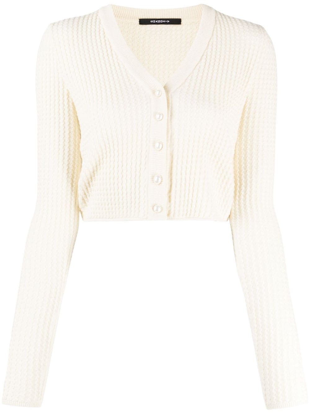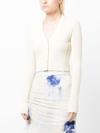 V-neck ribbed cardigan Highlights - Cream white - Wool blend - Ribbed knit - V-neck - Front button fastening - Long sleeves - Straight hem - Cropped Made in Italy Composition Wool 90%, Polyester 10% SIZE & FIT Model measurements Height 5 ft 9 in(1.76 m) Bust/Chest 31.1 in(79 cm) Hips 35.03 in(89 cm) Waist 24.4 in(62 cm) FittingInformation Designed for a close fit throughout Cropped in length Made with a midweight knit, this piece offers some stretch This piece fits large – take one size down