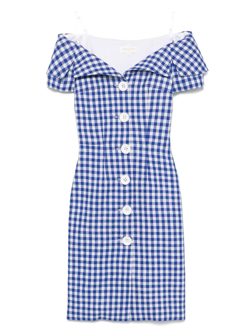 gingham check-print mini dress Highlights - Royal blue - Front button fastening - Off-shoulder - Sleeveless - Notched lapels Imported Composition Outer: Wool 53%, Linen/Flax 47% Lining: Polyester 100% SIZE & FIT Model measurements Height 5 ft 10 in(1.78 m) Bust/Chest 33.46 in(85 cm) Hips 36.22 in(92 cm) Waist 23.22 in(59 cm) FittingInformation Designed for a slim fit that sits just away from the body offering a close yet comfortable fit The adjustable shoulder straps allow for a preferred fit when worn Made from a midweight non-stretch fabric