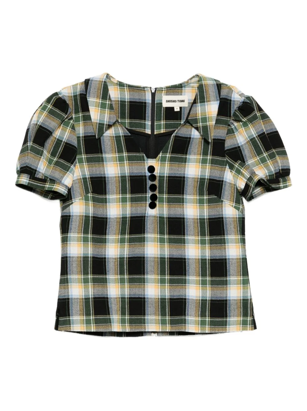 plaid blouse Highlights - Dark green - Front button fastening - Rear zip fastening - V-neck - Short sleeves Imported Composition Lining: Polyester 100% Outer: Viscose 62%, Wool 38% Washing instructions Dry Clean Only