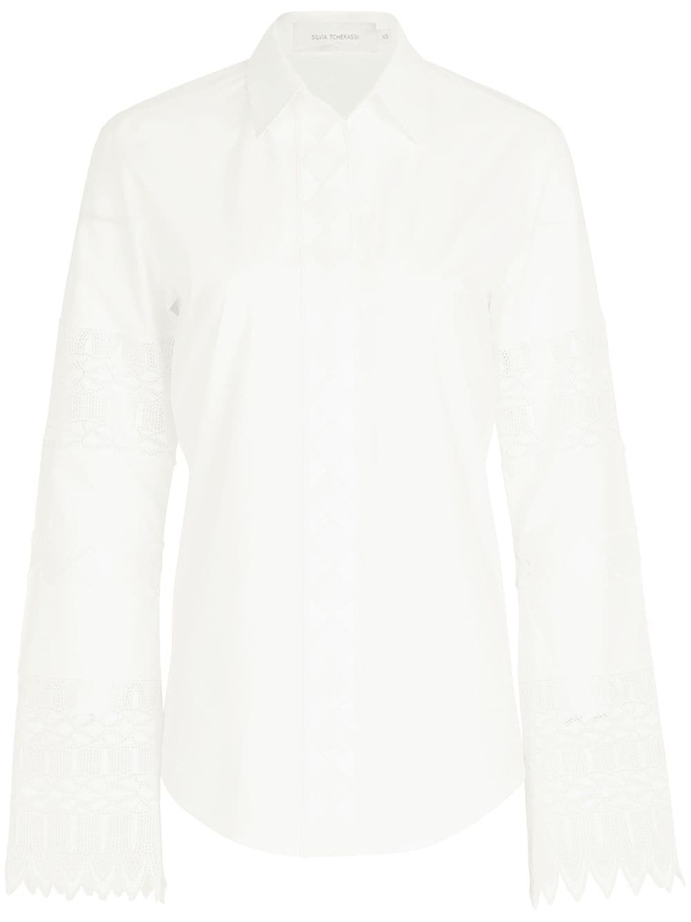 Aspasia organic-cotton blouse Highlights - White - Organic cotton - Poplin texture - Guipure lace panelling - Classic collar - Concealed front fastening - Long sleeves - Curved hem Imported Composition Organic Cotton 100%