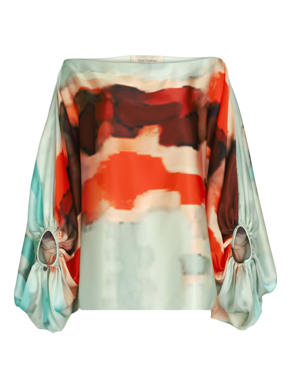Bellagio blouse Highlights - Aqua blue - Abstract print - Balloon sleeves - Off-shoulder Imported Composition Silk 94%, Elastane 6% Washing instructions Dry Clean Only