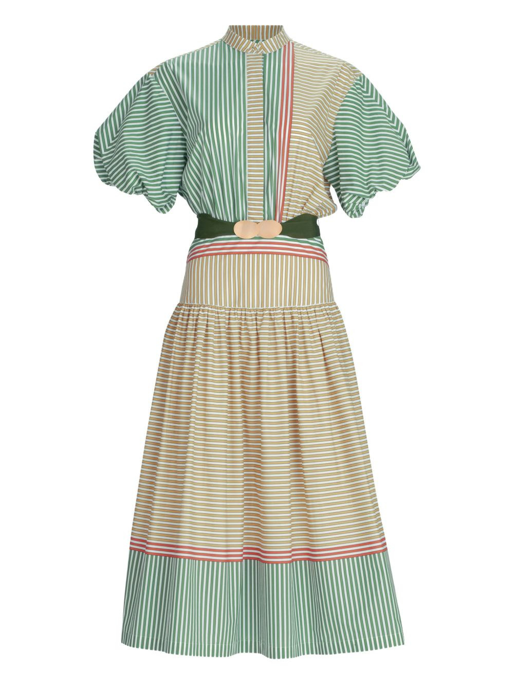 Jil midi dress Highlights - Green and yellow - Contrasting horizontal and vertical stripes - Band collar - Short puff sleeves - Gathered waist with belt detail - Pleated skirt Imported Composition Viscose 51%, Acetate 49% Washing instructions Dry Clean Only