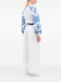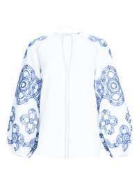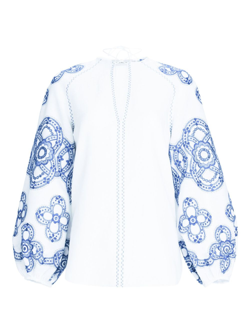 Molveno blouse Highlights - White - Floral pattern - Tie detail at neckline - Gathered balloon sleeves - Contrasting blue stitching Imported Composition Organic Linen 90%, Organic Cotton 10% Washing instructions Dry Clean Only
