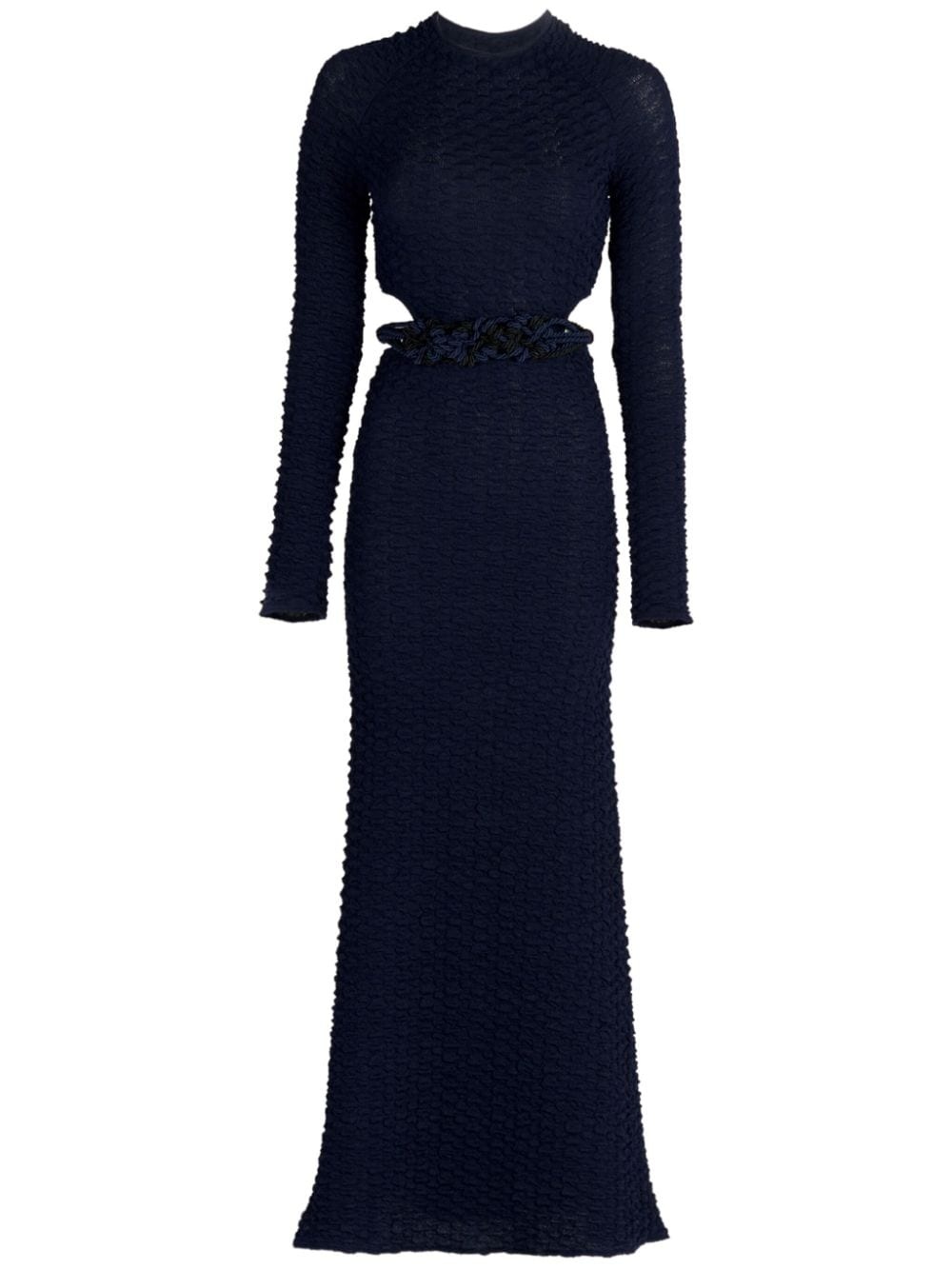 Myriam cut out-detail maxi dress Highlights - Navy blue - Organic cotton blend - Cut-out detailing - Belted waist - Round neck - Long sleeves - Maxi - Flared hem Imported Composition Organic Cotton 70%, Polyamide 30%