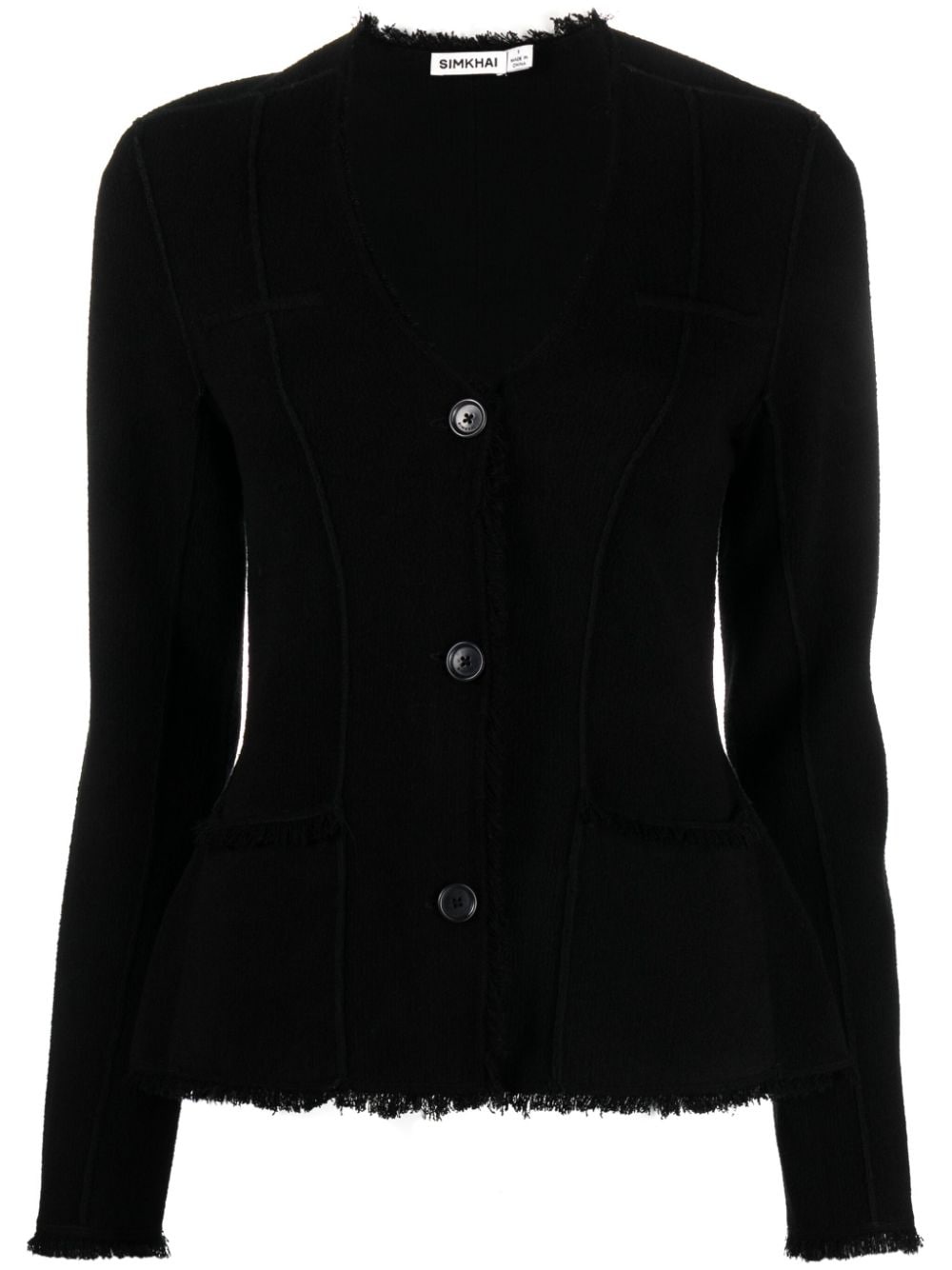 Medina single-breasted blazer Highlights - Black - Frayed detailing - Frayed edge - V-neck - Front button fastening - Long sleeves Imported Composition Cotton 42%, Viscose 41%, Nylon 14%, Spandex/Elastane 3% SIZE & FIT Model measurements Height 5 ft 11 in(1.8 m) Bust/Chest 31.88 in(81 cm) Hips 35.03 in(89 cm) Waist 24.01 in(61 cm)