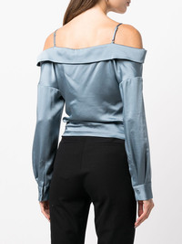 off-the-shoulder satin top blue satin finish spaghetti straps off-shoulder shirt sleeves V-neck Imported Composition Body: Acetate 89%, Polyethylene 11% SIZE & FIT Model measurements Height 5 ft 10 in(1.77 m) Bust/Chest 33.85 in(86 cm) Hips 35.03 in(89 cm) Waist 24.01 in(61 cm) FittingInformation This piece fits true to size. We recommend you get your regular size Cut for a slim fit Made with a mid-weight fabric Washing instructions Dry Clean Only
