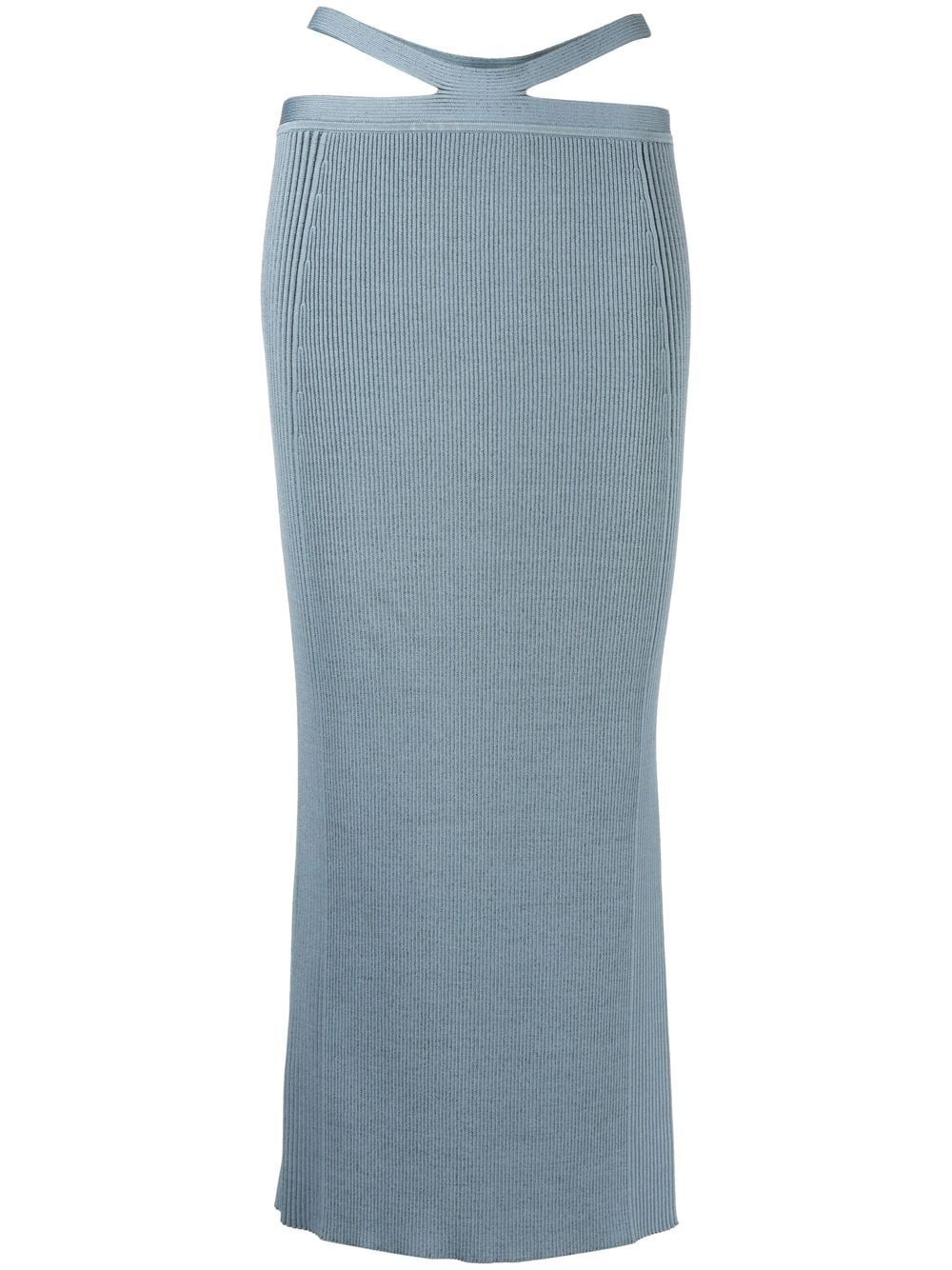 side ribbed-detail midi skirt slate blue stretch-design cut-out detailing ribbed detailing elasticated waistband mid-length Made in United States Composition Rayon 72%, Nylon 27%, Elastane 1% SIZE & FIT Model measurements Height 5 ft 10 in(1.78 m) Bust/Chest 33.07 in(84 cm) Hips 33.85 in(86 cm) Waist 25.19 in(64 cm) Measurement HIPS 26.77 in(68 cm) LENGTH 35.03 in(89 cm) WAIST 26.77 in(68 cm) FittingInformation This piece fits true to size. We recommend you get your regular size Designed to be fitted at the waist and through the thigh, loose from the knee Made with a mid-weight stretch fabric Washing instructions Dry Clean Only