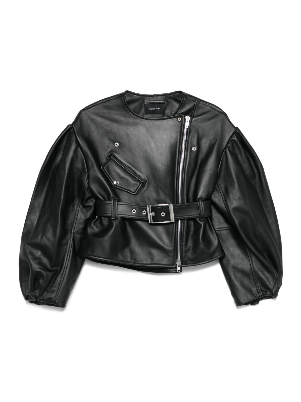 belted puff-sleeve leather jacket