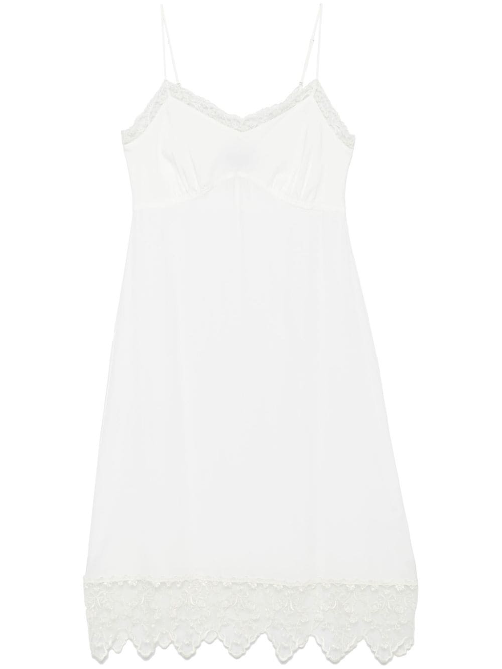 lace-trim midi dress Highlights - White - Crepe de chine - Lace trim - Sweetheart neck - Two adjustable shoulder straps - Gathered detailing - Unlined - Flared hem Imported Composition Polyamide 100%, Viscose 100%, Acetate 73%, Silk 27% SIZE & FIT Model measurements Height 5 ft 10 in(1.78 m) Bust/Chest 33.46 in(85 cm) Hips 36.22 in(92 cm) Waist 23.22 in(59 cm) FittingInformation Designed for a slim fit that sits just away from the body offering a close yet comfortable fit The adjustable shoulder straps allow for a preferred fit when worn Made from a lightweight non-stretch fabric