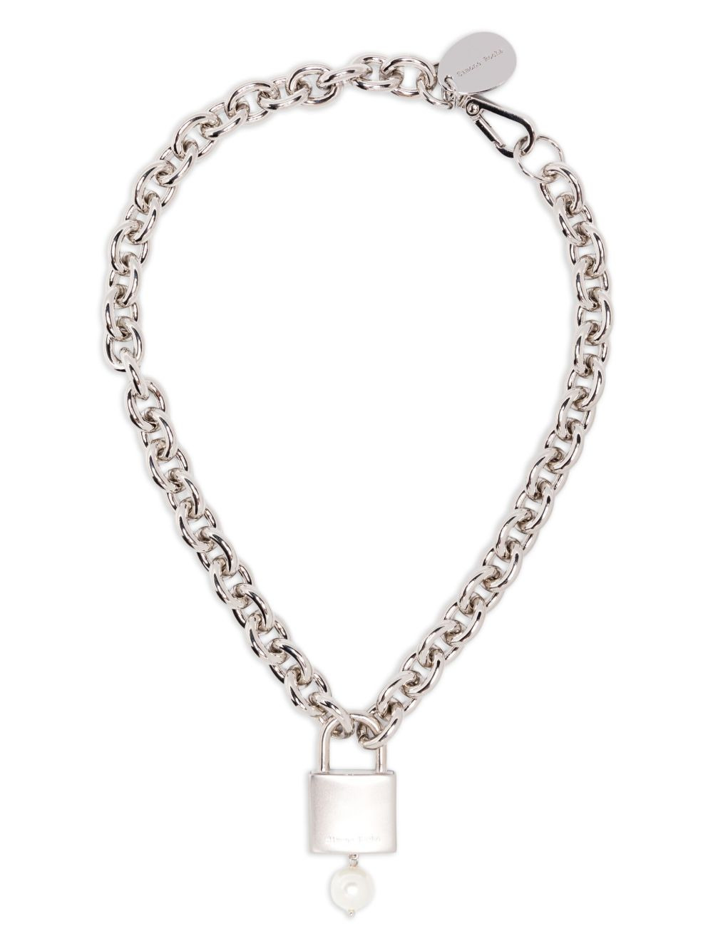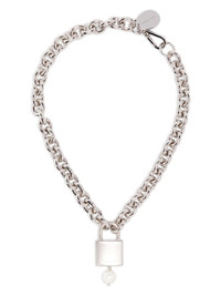 padlock pearl necklace Highlights - Silver - Curb chain - Padlock pendant - Pearl embellishment - Engraved brand name - Lobster clasp fastening Imported SIZE & FIT Model measurements Height 5 ft 11 in(1.8 m) Bust/Chest 32.67 in(83 cm) Hips 36.22 in(92 cm) Waist 24.4 in(62 cm) Measurement Length when open 16.14 in(41 cm) PENDANT LENGTH 1.69 in(4.3 cm) PENDANT WIDTH 0.78 in(2 cm) WIDTH 0.43 in(1.1 cm)