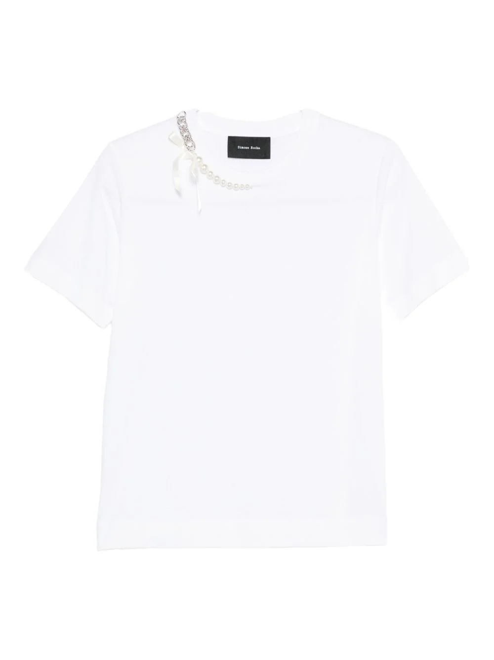 pearl-detail T-shirt Highlights - White - Pearl embellishment - Ribbon detail - Chain detail - Round neck - Short sleeves Imported Composition Cotton 100% SIZE & FIT Model measurements Height 5 ft 9 in(1.76 m) Bust/Chest 31.49 in(80 cm) Hips 35.43 in(90 cm) Waist 23.62 in(60 cm) Washing instructions Read Manufacturer Guidelines