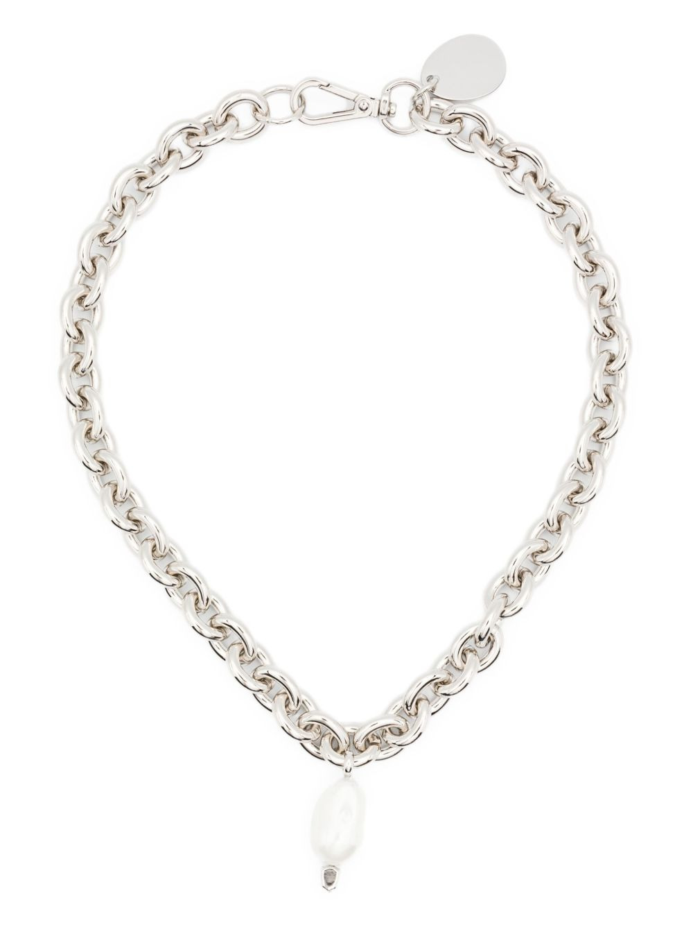 pearl-drop chain necklace Highlights - Silver-tone - Curb chain - Pearl embellishment - Circular pendant - Lobster clasp fastening Imported SIZE & FIT Model measurements Height 5 ft 9 in(1.75 m) Bust/Chest 34.64 in(88 cm) Hips 36.61 in(93 cm) Waist 26.37 in(67 cm)