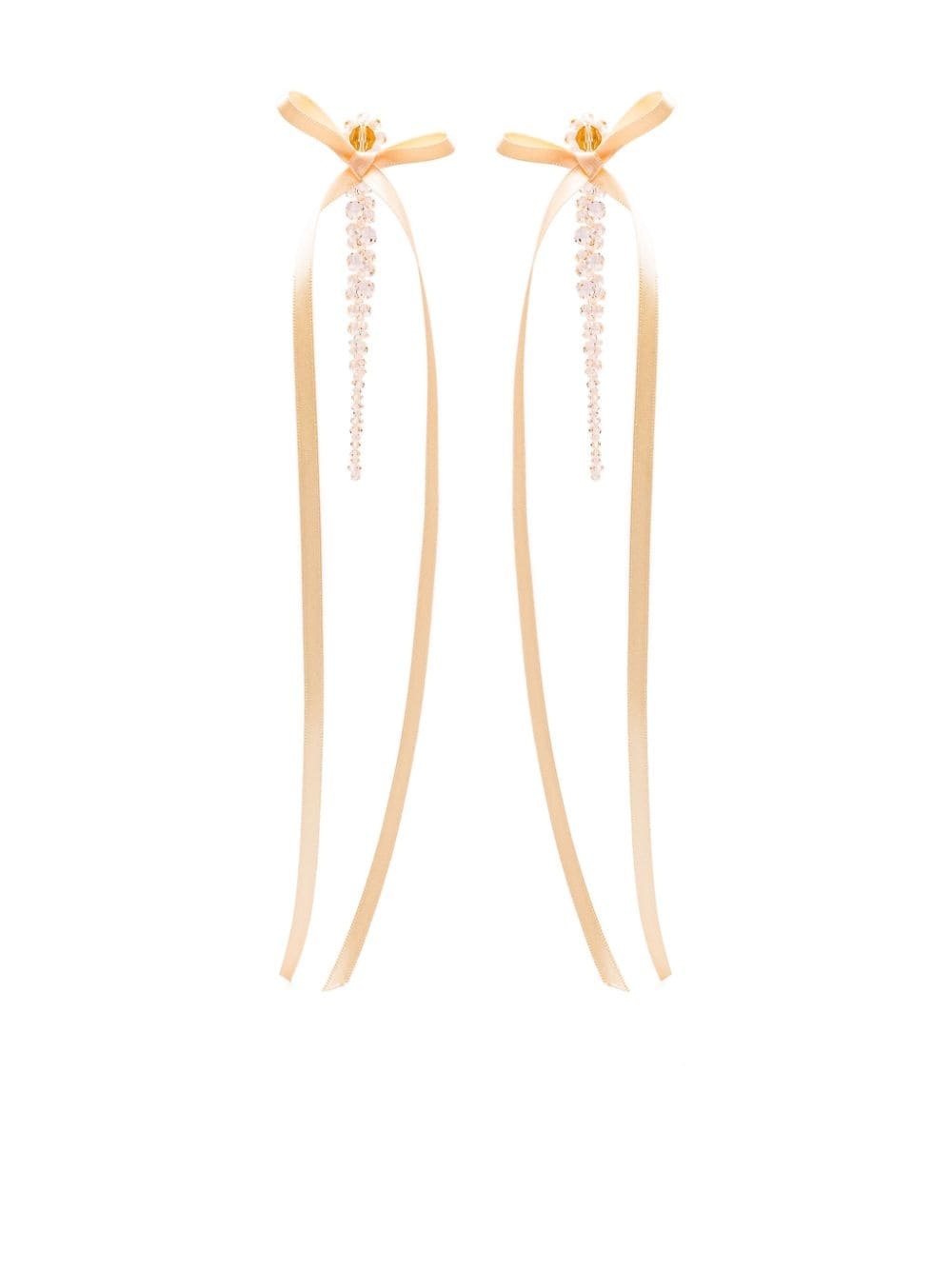 ribbon bow dangle earrings Highlights - Light pink - Dangle design - Crystal embellishment - Ribbon fastening bow detailing - Butterfly fastening - For pierced ears - These earrings come as a pair. Imported SIZE & FIT Model measurements Height 5 ft 10 in(1.77 m) Bust/Chest 32.28 in(82 cm) Hips 35.03 in(89 cm) Waist 25.19 in(64 cm) Measurement HEIGHT 7.87 in(20 cm) Weight (single earring) 4 g(4 g) WIDTH 1.96 in(5 cm)