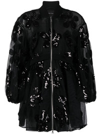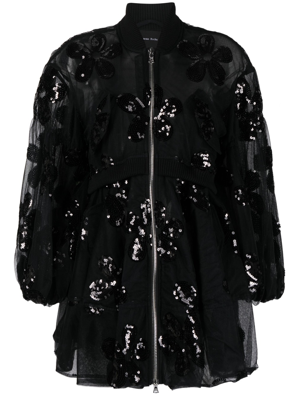 sequin-embellished tulle coat Always playing with silhouettes, Simone Rocha introduces this bomber-style coat. It is designed with a band collar and long puff sleeves, however, it is defined by the sequin-embellished floral tulle fabric that lends it a playful feel. Highlights - Black - Tulle overlay - Sequin embellishment - Band collar - Drop shoulder - Long puff sleeves - Front two-way zip fastening - Mid-length Imported Composition Nylon 100%, Polyester 100%, Polyethylene 100%, Polyamide 100%, Wool 100% Washing instructions Dry Clean Only