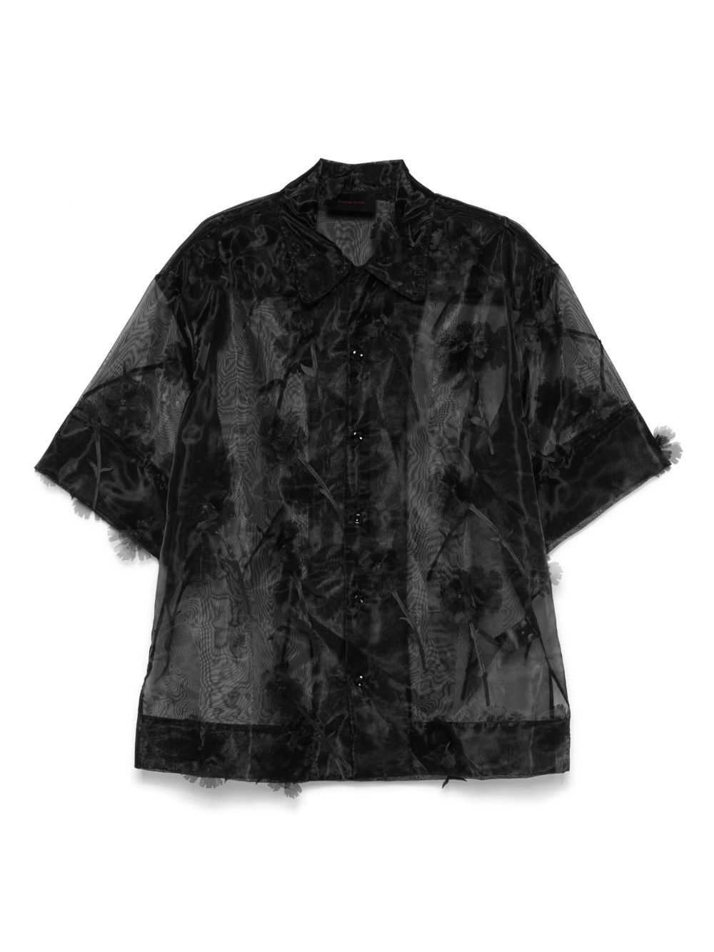 sheer shirt Highlights - Black - Front button fastening - Camp collar - Short sleeves - Floral applique Imported Composition Polyester 100%, Polyamide 100% SIZE & FIT Model measurements Height 6 ft 2 in(1.89 m) Bust/Chest 36.22 in(92 cm) Hips 35.82 in(91 cm) Waist 28.54 in(72.5 cm) FittingInformation Designed to be unstructured, offering a loose fit throughout Made from a lightweight non-stretch fabric