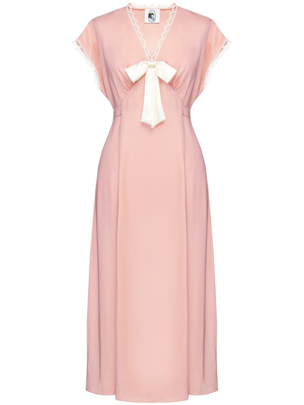 bow-detailing satin midi dress Highlights - Pink - Tied waist - V-neck - Short sleeves - Lace trim Imported Composition Ecovero 100%, Polyester 100%