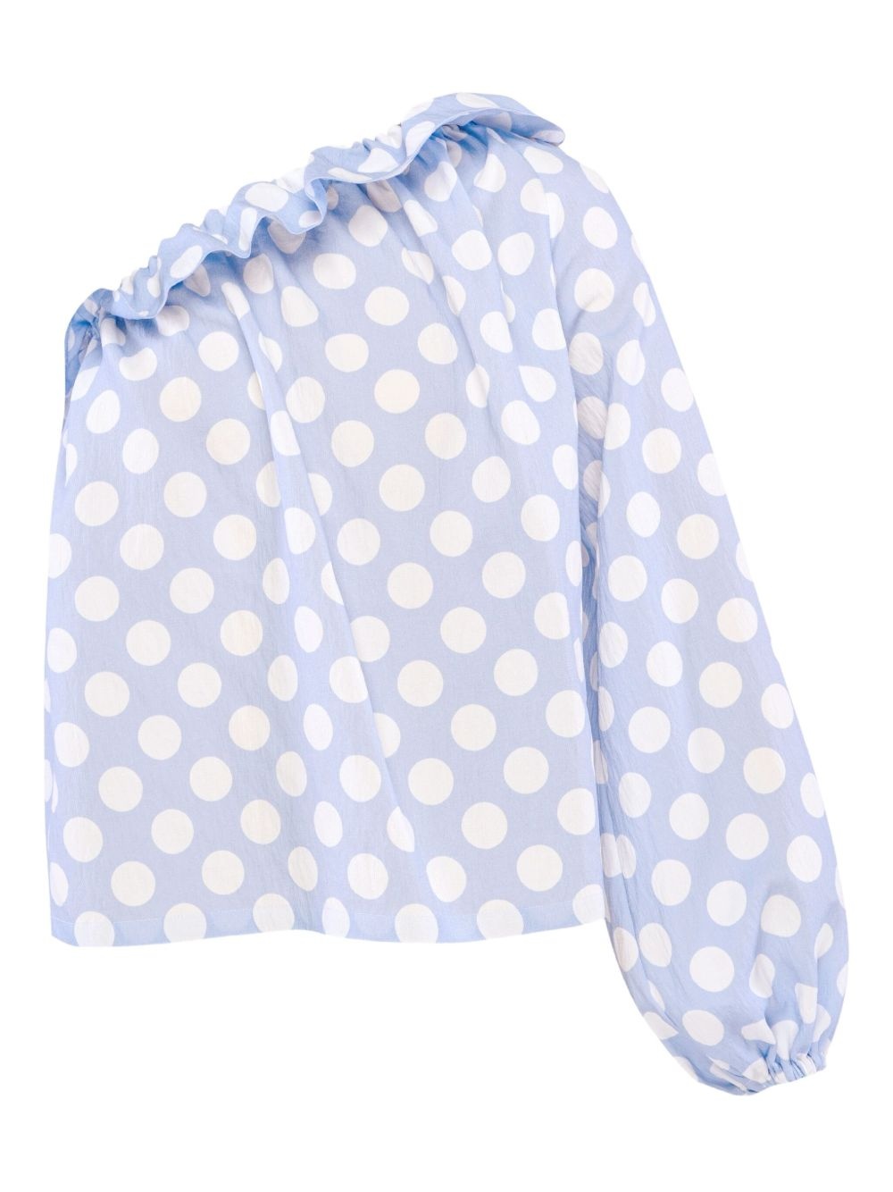polka-dot blouse Highlights - Blue - Polka dot print - Single long sleeve - One-shoulder Imported Composition Viscose 83%, Nylon 17% Washing instructions Read Manufacturer Guidelines