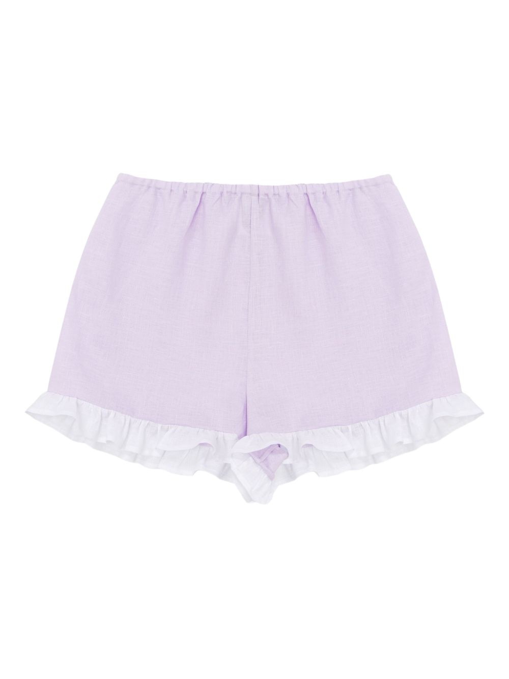 ruffled-hem shorts Highlights - Light purple - Ruffled trim - Elasticated waistband - Thigh length Imported Composition Organic Linen 100% Washing instructions Dry Clean Only