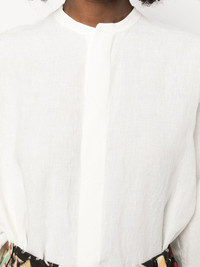 collarless linen shirt Highlights - White - Linen - Collarless - Concealed front fastening - Long sleeves - Buttoned cuffs - Curved hem Imported Composition Linen/Flax 100% SIZE & FIT Model measurements Height 5 ft 10 in(1.78 m) Bust/Chest 31.49 in(80 cm) Hips 37 in(94 cm) Waist 23.62 in(60 cm) FittingInformation This piece fits true to size. We recommend you get your regular size Cut for a loose fit Made with a mid-weight non-stretch fabric Washing instructions Hand Wash