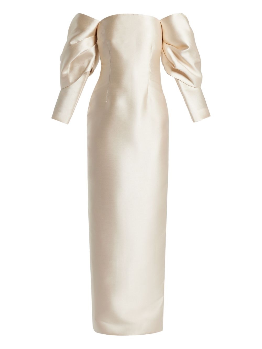 off-shoulder dress Highlights - Beige - Rear zip fastening - Long puff sleeves - Rear slit Imported Composition Lining: Polyester 95%, Elastane 5% Outer: Polyester 100% Washing instructions Dry Clean Only