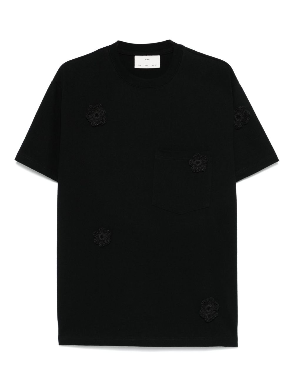 Daisy-applique T-shirt Highlights - Black - Chest patch pocket - Crew neck - Short sleeves Imported Composition Jute 100%, Cotton 100% SIZE & FIT Model measurements Height 6 ft 2 in(1.87 m) Bust/Chest 36.22 in(92 cm) Hips 37 in(94 cm) Waist 27.95 in(71 cm) FittingInformation Designed to be unstructured, offering a loose fit throughout Made from a midweight non-stretch fabric, this piece offers minimal elasticity when worn