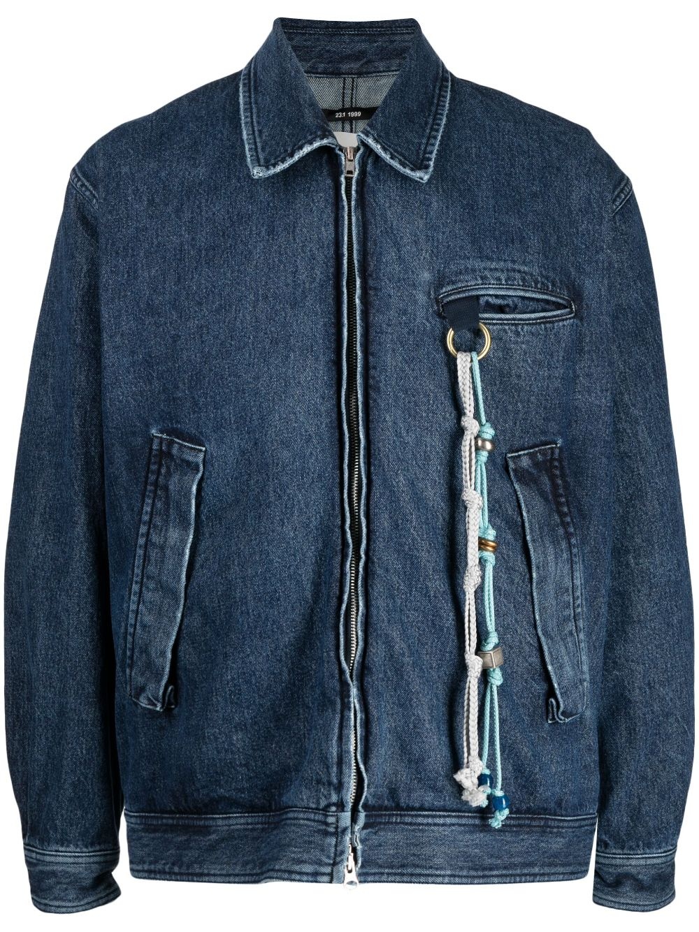 three-pocket bomber denim jacket Highlights - Indigo blue - Cotton - Classic collar - Front zip fastening - Long sleeves - Zip-fastening chest pocket - Two side zip-fastening pockets - Straight hem Imported Composition Cotton 100% Washing instructions Dry Clean Only