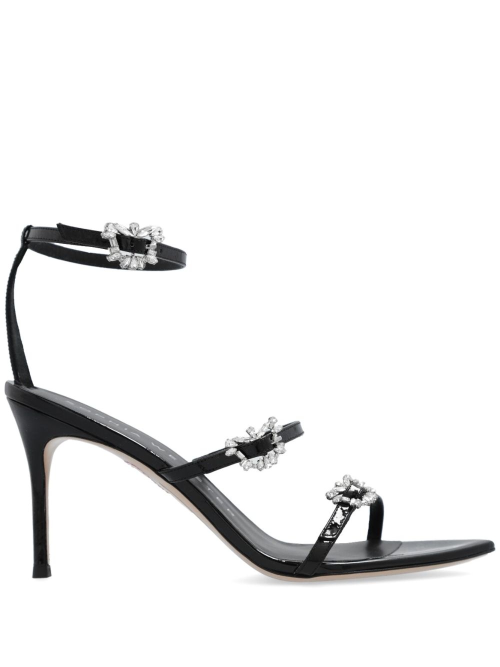 Grace crystal-embellished sandals Highlights - Black - Leather - Patent finish - Crystal embellishment - Strap detailing - Buckle-fastening ankle strap - Open toe - Branded heel counter - High stiletto heel Imported Composition Outer: Calf Leather 100% Sole: Leather 100% Lining: Leather 100%