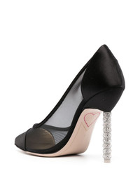 Jasmine 110mm crystal-embellished pumps Sophia Webster updates its signature Jasmine pumps with a panelled design in satin and sheer mesh. The sleek pointed-toe design sits atop its usual sculpted crystal-encrusted heels. Made in Italy Composition Lining: Calf Leather 100%, Fabric 100% Sole: Calf Leather 100% Outer: Fabric 100% SIZE & FIT Measurement HEEL 4.33 in(11 cm) Sole height 0.39 in(1 cm)