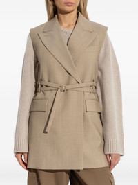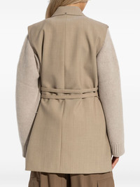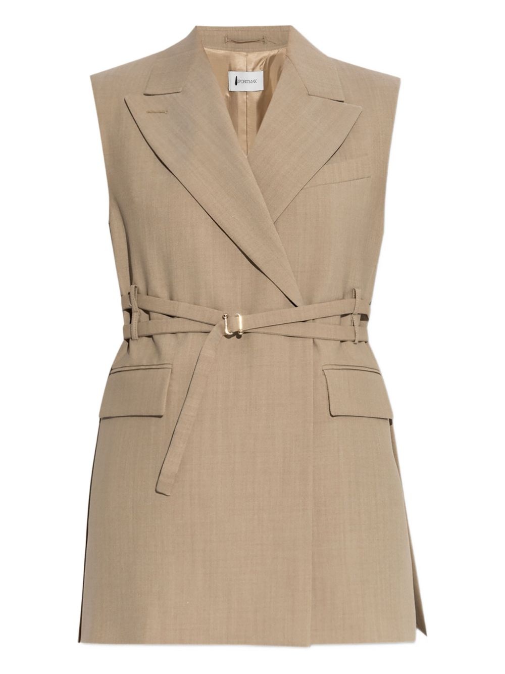 belted wool waistcoat Highlights - Beige - Peak lapels - Belted waist - Sleeveless - Double-breasted - Flap pockets Made in Italy Composition Virgin Wool 100% Washing instructions Read Manufacturer Guidelines