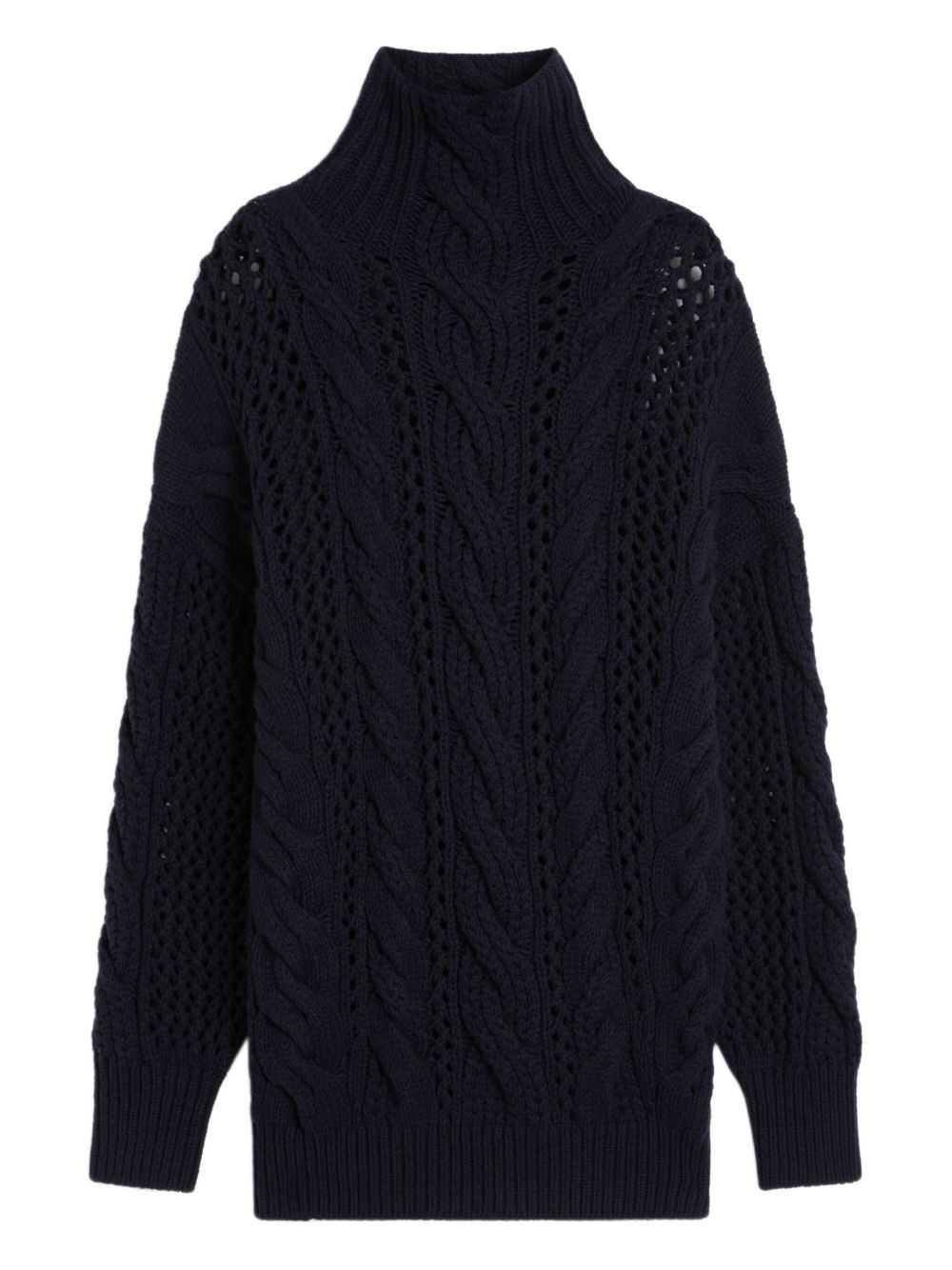 CALCO cable-knit eyelet-detail sweater Highlights - Navy blue - Cable knit - Eyelet detail - High neck - Long sleeves Imported Composition Wool 70%, Polyamide 30% Washing instructions Read Manufacturer Guidelines