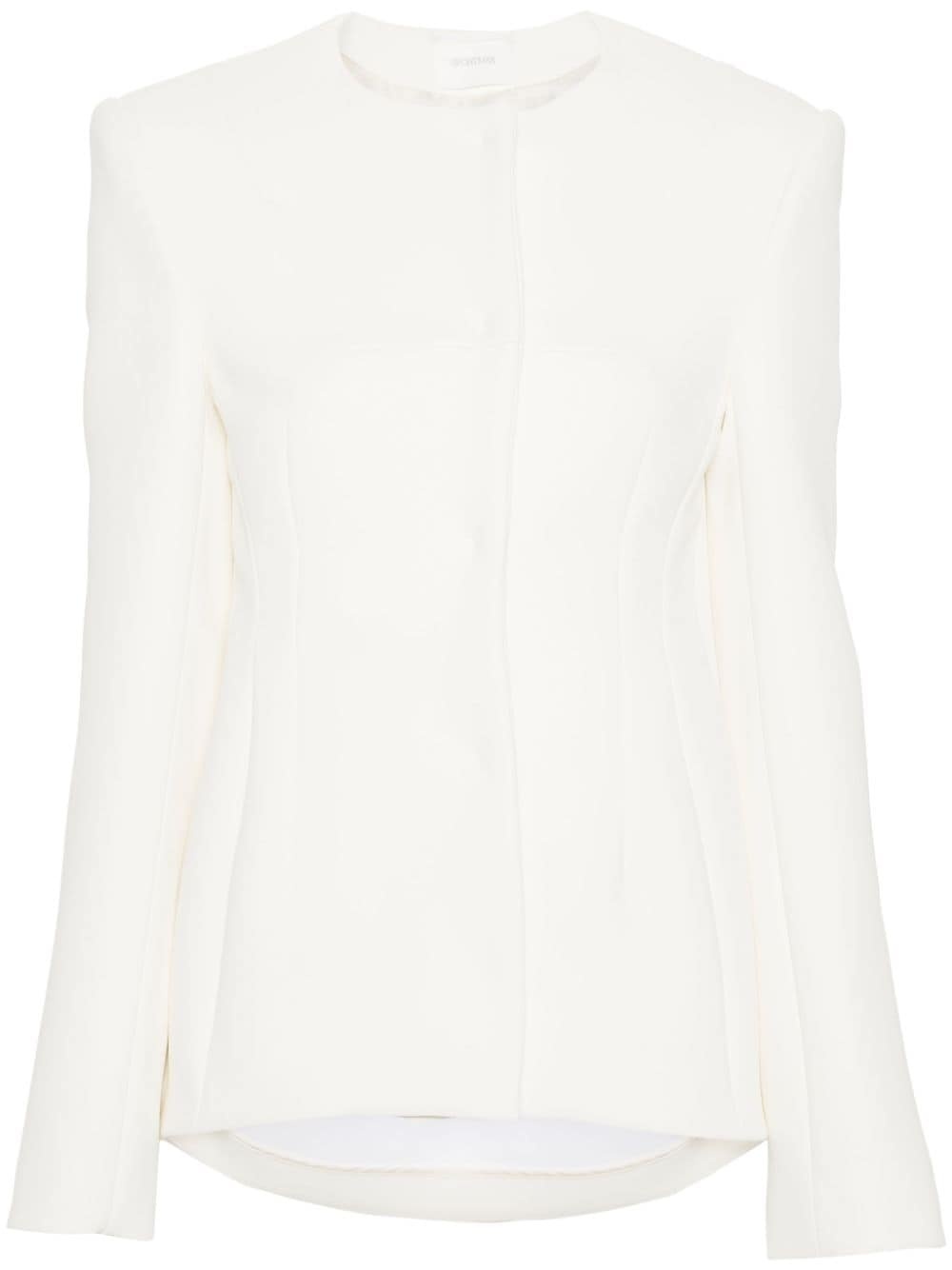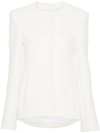 dart-detail fitted jacket Highlights - Ivory white - Crepe texture - Round neck - Dart detailing - Shoulder pads - Long sleeves - Rear pleat detailing - Partial lining - Straight hem - Concealed press-stud fastening Made in Italy Composition Lining: Acetate 69%, Cupro 31% Outer: Polyester 100% SIZE & FIT Model measurements Height 5 ft 10 in(1.78 m) Bust/Chest 33.07 in(84 cm) Hips 35.82 in(91 cm) Waist 25.98 in(66 cm) FittingInformation Designed to be unstructured, offering a loose fit throughout The internal shoulder pads offer a structured shape Made from a midweight non-stretch fabric This piece fits true to size – take your usual size
