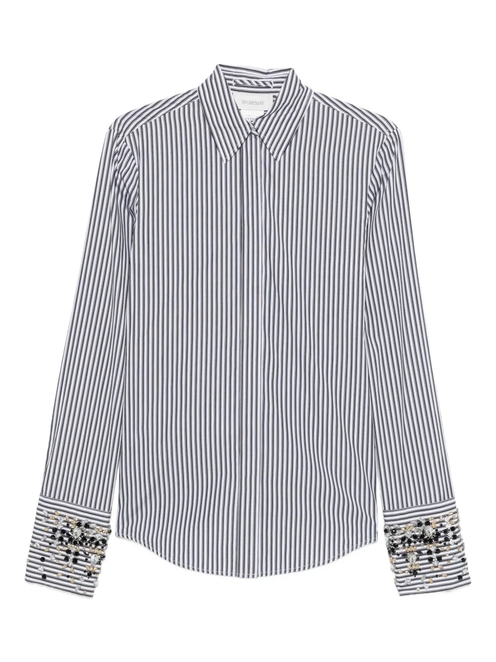 embellished striped shirt Highlights - White and black - Striped - Embellishments at the cuff - Button fastening - Pointed collar - Long sleeves Imported Composition Cotton 100% SIZE & FIT Model measurements Height 5 ft 10 in(1.78 m) Bust/Chest 31.49 in(80 cm) Hips 37 in(94 cm) Waist 23.62 in(60 cm) Washing instructions Hand Wash