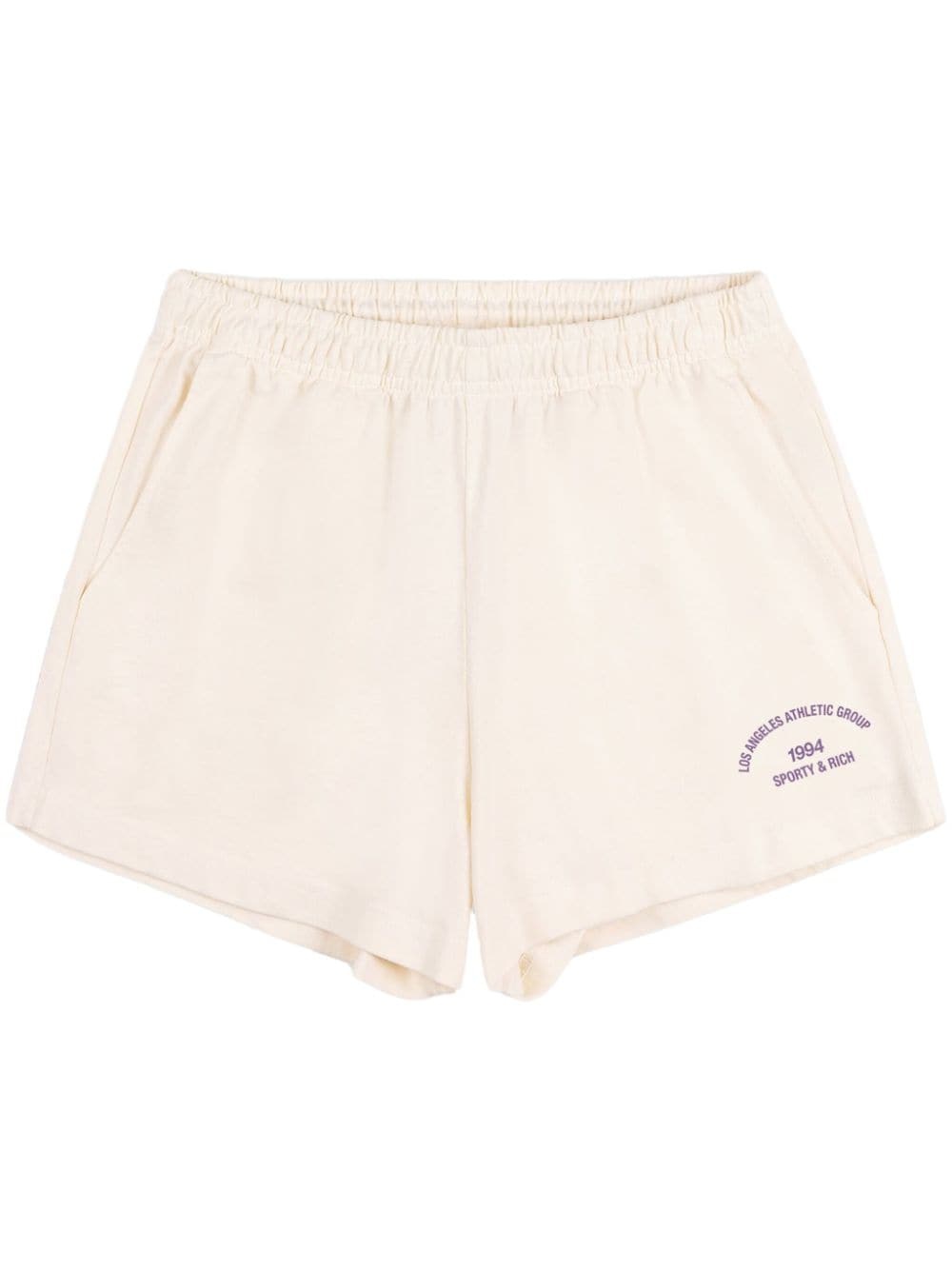 Bardot slogan-print shorts Highlights - Cream white/violet purple - Cotton - Jersey texture - Garment dyed - Slogan print - Thigh-length - Elasticated waistband - Two side inset pockets - Rear patch pocket Made in United States Composition Cotton 100%