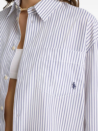 cotton shirt Highlights - Navy blue - Front button fastening - Vertical stripe pattern - Embroidered logo to the front - Classic collar Imported Composition Cotton 100% SIZE & FIT Measurement SLEEVE LENGTH 23.62 in(60 cm) LENGTH 34.25 in(87 cm) BUST 52.75 in(134 cm) Shoulder Width 21.25 in(54 cm)