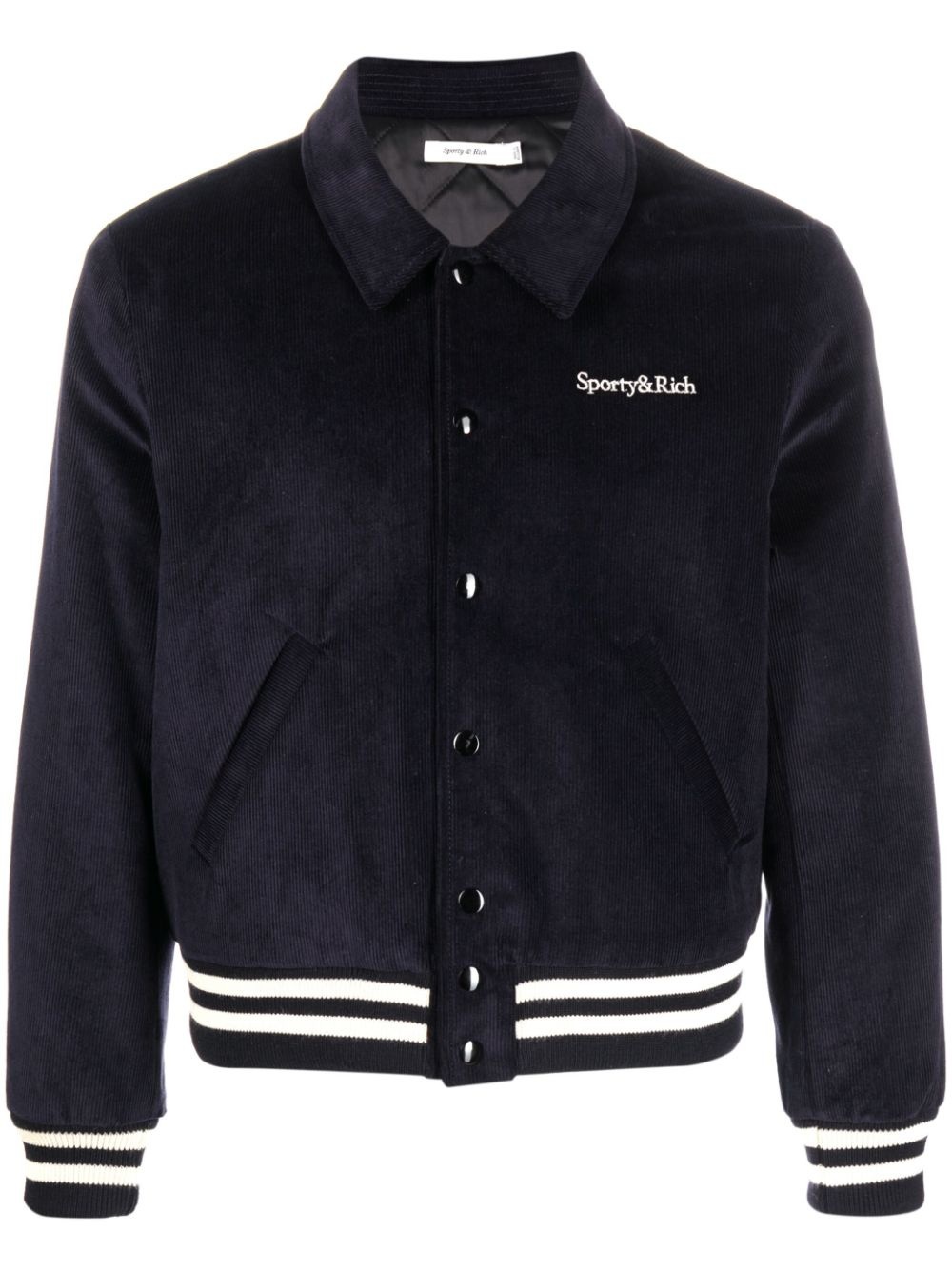 embroidered-logo bomber jacket navy blue cotton contrasting border embroidered logo at the chest slogan print to the rear classic collar front press-stud fastening two side welt pockets long sleeves straight hem When buying this unisex item, keep in mind that it is graded in standard men's sizing. Imported Composition Lining: Polyester 50%, Viscose 50% Outer: Cotton 100% SIZE & FIT Model measurements Height 5 ft 10 in(1.77 m) Bust/Chest 32.28 in(82 cm) Hips 35.03 in(89 cm) Waist 25.19 in(64 cm) Measurement CHEST 38.58 in(98 cm) SLEEVE LENGTH 22.83 in(58 cm) Shoulder Width 16.92 in(43 cm) FittingInformation This unisex piece runs small but is designed for a relaxed fit – take one size up The ribbed hem offers a close, comfortable fit Made from a midweight non-stretch fabric Washing instructions Dry Clean Only