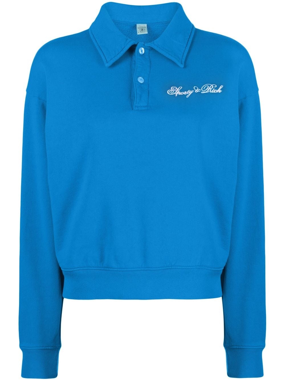 logo-embroidered polo-collar sweatshirt Echoing the brand's nonchalant, fresh and athleisure based aesthetic, Sporty & Rich presents this sweatshirt. Crafted from striking blue cotton, it's adorned with a signature logo on the left chest. Highlights - Royal blue/white - Cotton - Jersey texture - Embroidered logo at the chest - Polo collar - Front button placket - Drop shoulder - Long sleeves - Ribbed cuffs and hem - Fleece lining Made in United States Composition Cotton 100% SIZE & FIT Model measurements Height 5 ft 10 in(1.79 m) Bust/Chest 31.1 in(79 cm) Hips 35.03 in(89 cm) Waist 24.01 in(61 cm) FittingInformation Designed for a relaxed fit, this piece allows for comfort and movement when worn Made from a midweight non-stretch fabric, this piece offers minimal elasticity when worn This piece fits true to size – take your usual size Washing instructions Machine Wash