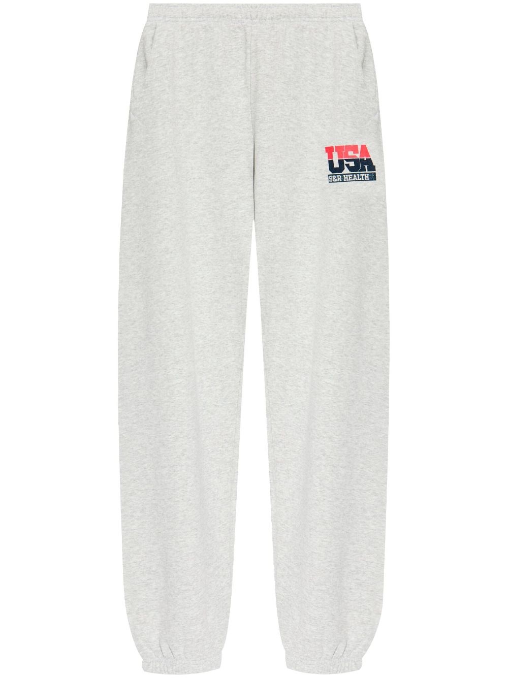 logo-print elasticated trousers Highlights - Grey - Cotton blend - Elasticated waistband - Logo print at the leg - Two side slit pockets - Elasticated ankles - Rear patch pocket - When buying this unisex item, keep in mind that it is graded in standard men's sizing. Made in United States Composition Cotton 97%, Polyester 3%