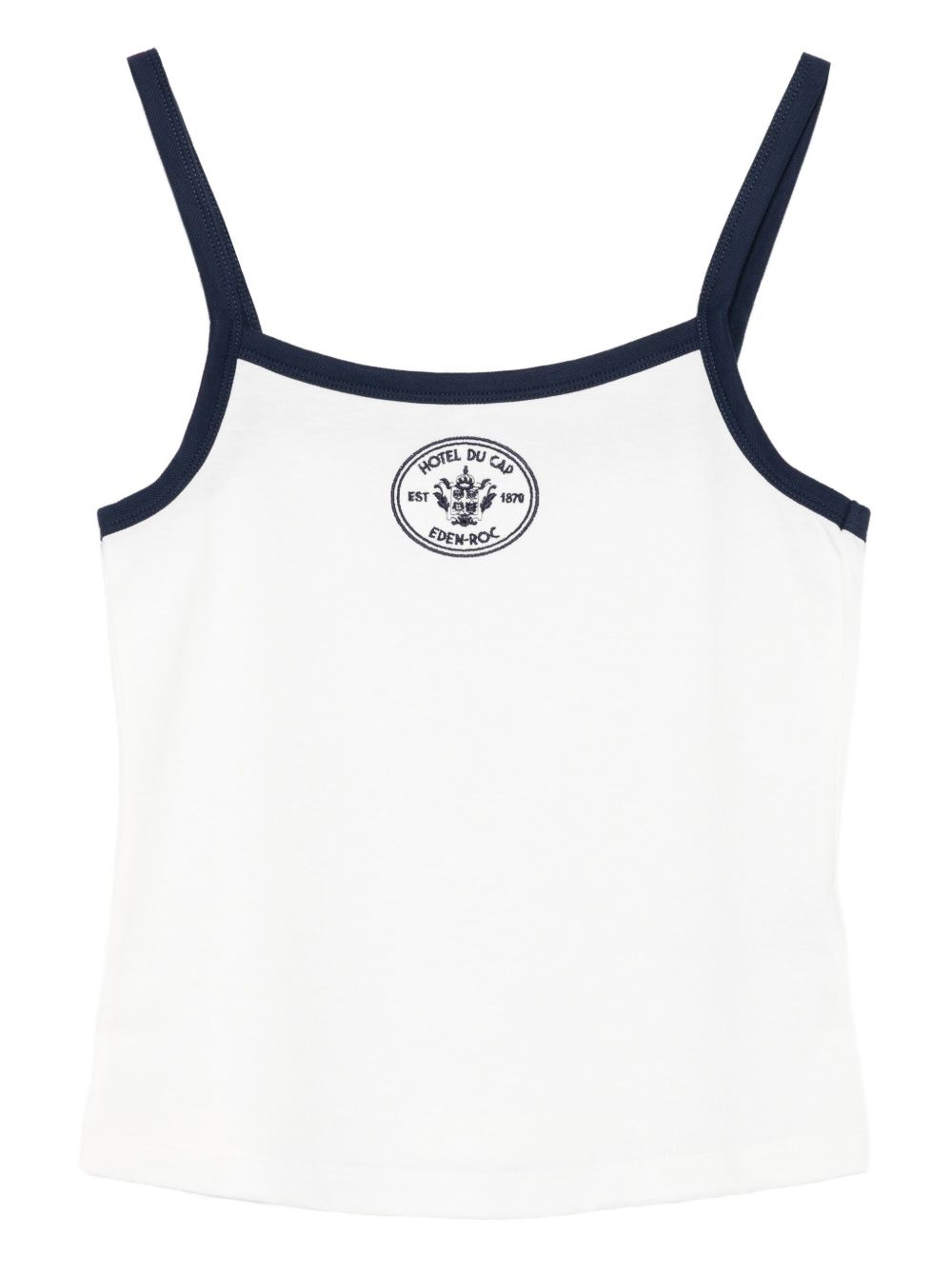 navy-trimmed cotton top Highlights - White - Navy trim - Spaghetti straps - Round neck - Graphic print - Cotton material Imported Composition Cotton 97%, Elastane 3% SIZE & FIT Model measurements Height 5 ft 10 in(1.77 m) Bust/Chest 33.07 in(84 cm) Hips 37 in(94 cm) Waist 24.8 in(63 cm) Washing instructions Machine Wash