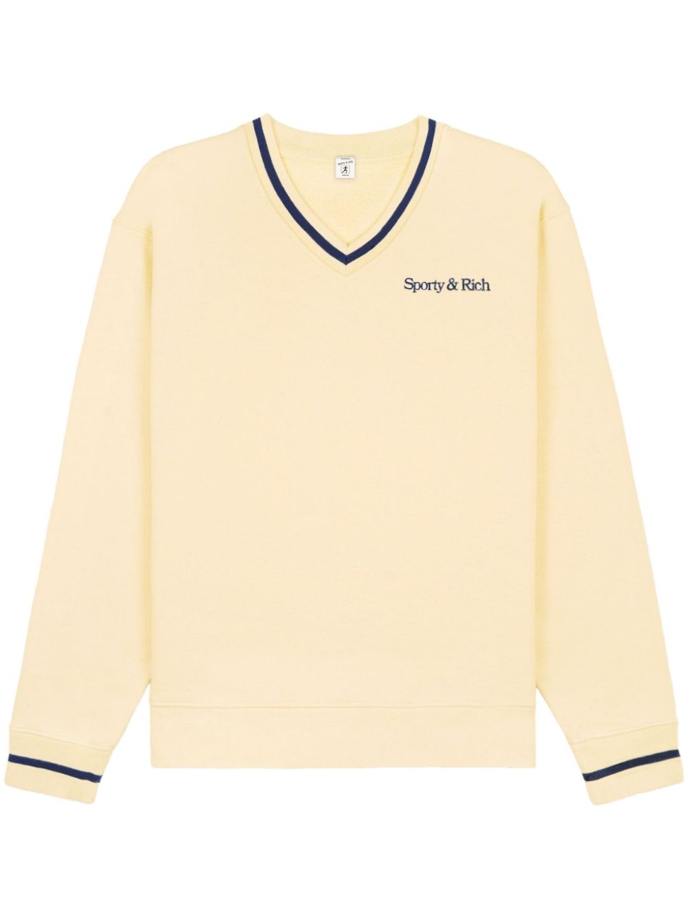 New Serif V-neck jumper Highlights - Citrin pale yellow/navy blue - Fine ribbed cotton - Embroidered logo at the chest - Ribbed v-neck - Ribbed cuffs and hem - Long sleeves - Straight hem - When buying this unisex item, keep in mind that it is graded in standard men's sizing. Imported Composition Cotton 100% Washing instructions Read Manufacturer Guidelines