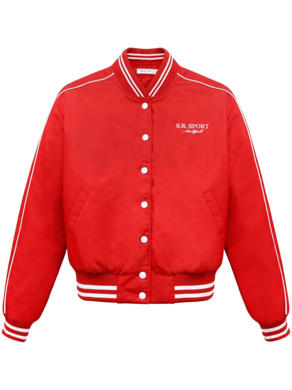 SR Sporty varsity jacket Highlights - Red/white - Stripe trim - Embroidered logo at the chest - Band collar - Front button fastening - Long sleeves - Elasticated cuffs - Straight hem - When buying this unisex item, keep in mind that it is graded in standard men's sizing. Imported Composition Polyamide 100% Washing instructions Read Manufacturer Guidelines