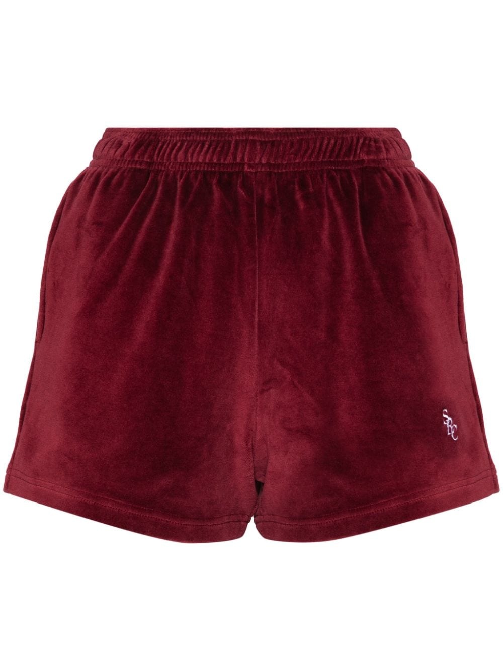 SRC velour mini shorts burgundy cotton velour elasticated waistband two side slit pockets embroidered logo at the leg rear patch pocket unlined Imported Composition Cotton 100% SIZE & FIT Model measurements Height 5 ft 11 in(1.8 m) Bust/Chest 33.07 in(84 cm) Hips 37.4 in(95 cm) Waist 25.19 in(64 cm) FittingInformation Designed for a slim fit that sits just away from the body offering a close yet comfortable fit The elasticated waist allows for a comfortable fit Made from a midweight non-stretch fabric, this piece offers minimal elasticity when worn This piece fits true to size – take your usual size