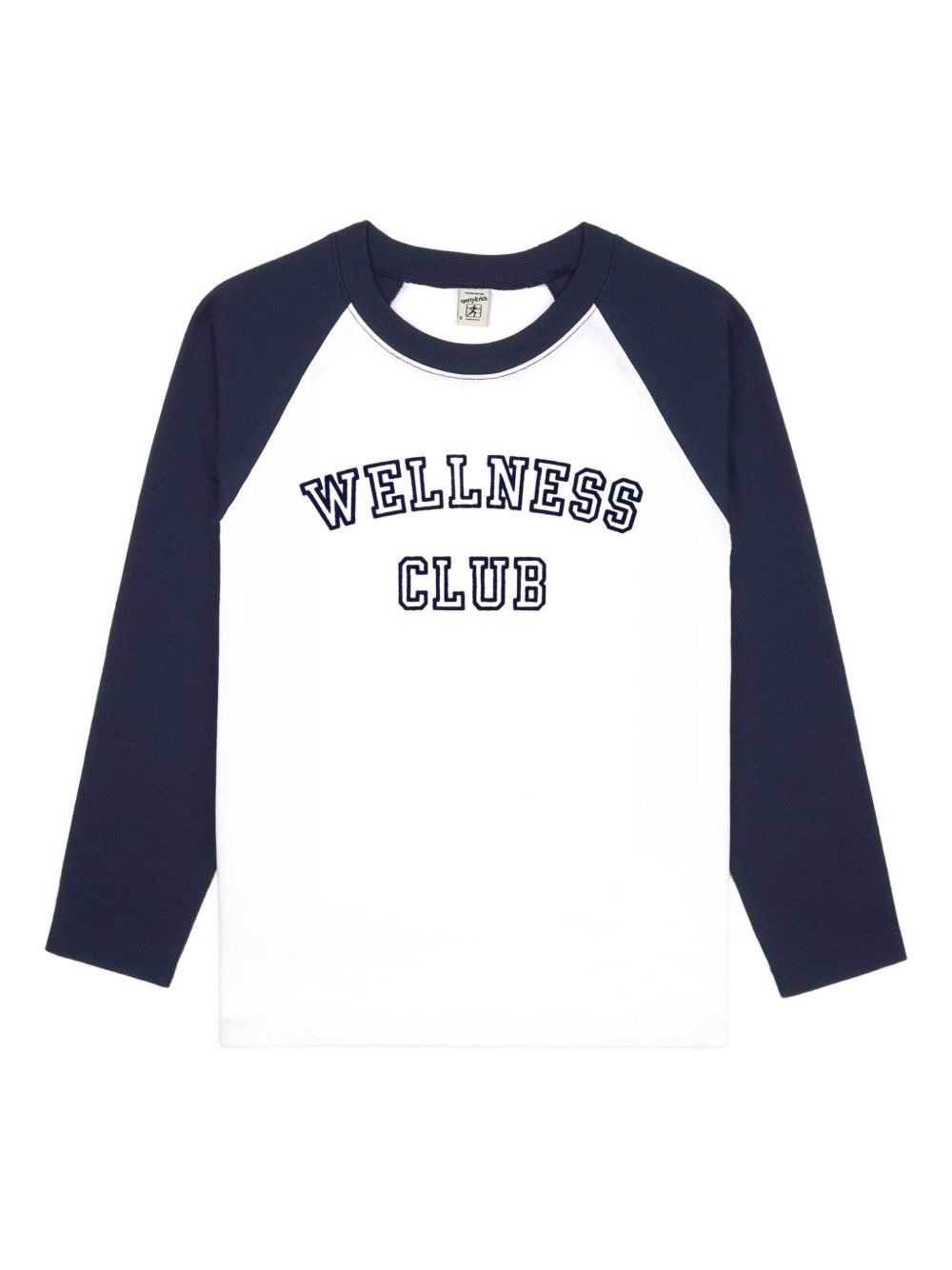 Wellness Club three-quarter-sleeve top Highlights - White - Navy blue raglan sleeves - Wellness club text - Three-quarter sleeves - Crew neck - Cotton Made in United States Composition Cotton 100% Washing instructions Read Manufacturer Guidelines
