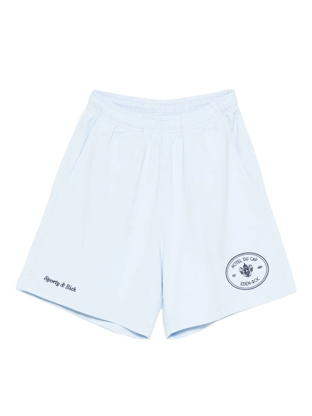 x Hotel Du Cap Eden Roc Eden Crest embroidered mini shorts Highlights - Sky blue - Embroidered logo - Elasticated waistband - Side pockets - Back pocket Imported Composition Cotton 100% Washing instructions Machine Wash