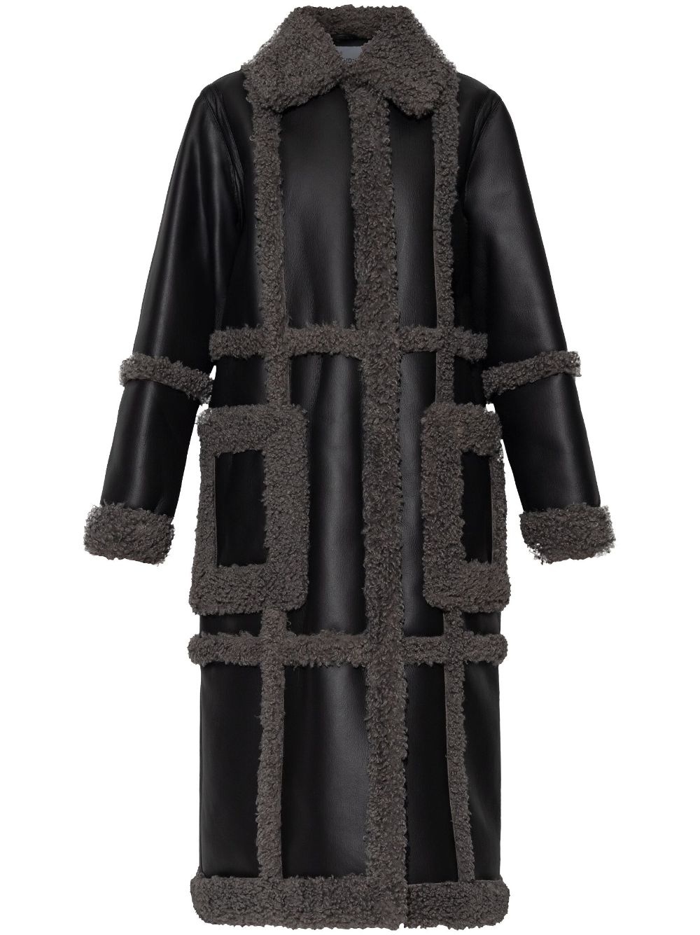 Patrice coat Highlights - Black/grey - Faux leather - Concealed press-stud fastening - Spread collar - Faux-shearling trim - Long sleeves - Two front patch pockets - Faux-shearling lining - Straight hem Imported Composition Polyester 100%, Polyurethane 100% SIZE & FIT FittingInformation Designed to be unstructured, offering a loose fit throughout Made from a midweight non-stretch fabric Washing instructions Read Manufacturer Guidelines