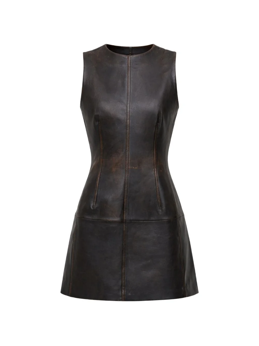 STAUD BINX LEATHER DRESS DISTRESSED BROWN