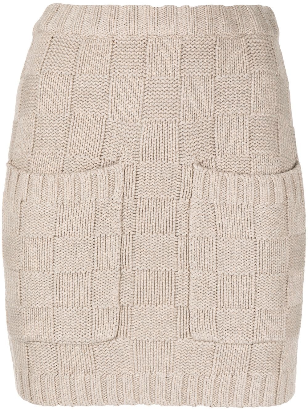 check-pattern knitted skirt brown cotton-blend knitted construction high waist above-knee length ribbed hem Imported Composition Cotton 60%, Nylon 30%, Wool 10% SIZE & FIT Model measurements Height 5 ft 10 in(1.78 m) Bust/Chest 28.34 in(72 cm) Hips 35.43 in(90 cm) Waist 23.62 in(60 cm) FittingInformation This piece fits true to size. We recommend you get your regular size Designed to be fitted at the waist and hips, loose over the leg Made with a mid-weight fabric Washing instructions Dry Clean Only