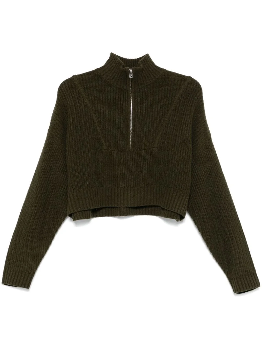 Hampton sweater Highlights - Olive green - Cashmere - Ribbed knit - Stand-up collar - Short front zip fastening - Drop shoulder - Long sleeves - Straight hem - Cropped Imported Composition Cashmere 100% SIZE & FIT Model measurements Height 5 ft 11 in(1.8 m) Bust/Chest 31.49 in(80 cm) Hips 36.61 in(93 cm) Waist 24.4 in(62 cm) FittingInformation Designed to be unstructured, offering a loose fit throughout Made with a midweight knit, this piece offers some stretch Washing instructions Dry Clean Only