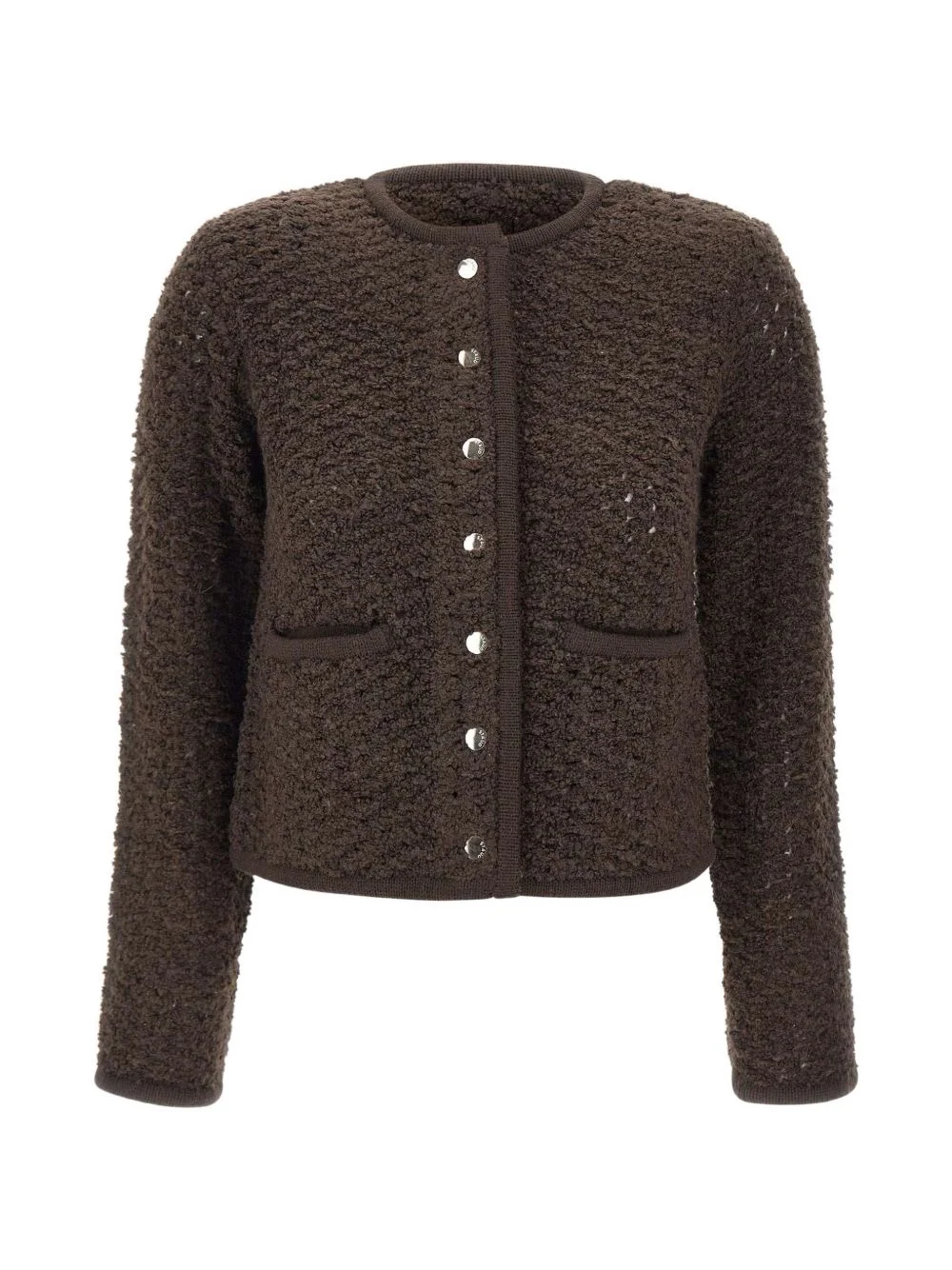 patch-pocket cardigan Highlights - Brown - Boucle knit - Crew neck - Front pockets - Metallic buttons Imported Composition Polyester 44%, Wool 31%, Nylon 25% Washing instructions Read Manufacturer Guidelines