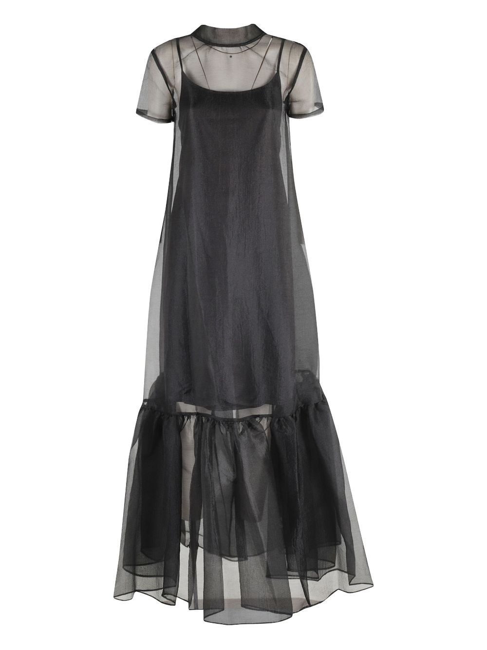 sheer ruffled maxi dress Highlights - Black - Ruffled detail - Semi-sheer construction - Short sleeves - Haterneck Imported Composition Polyester 100% Washing instructions Read Manufacturer Guidelines